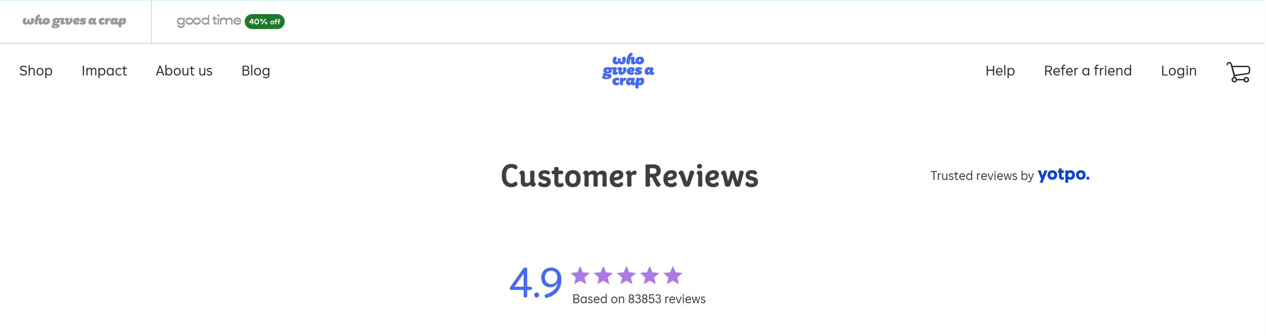 Just like Who Gives a Crap uses reviews, donations, and fun testimonials to build credibility, you can too, whether you’re just starting out or already growing.